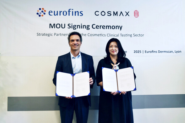 코스맥스는 프랑스 임상기관 유로핀즈(Eurofins)와 화장품 임상 시험 분야에 대하여 전략적 파트너십 협약을 체결했다고 2일 밝혔다.유로핀즈는 1987년에 설립돼 전세계 950개 이상의 연구소를 운영하고 있는 임상 전문 기업이다. 식품, 환경, 제약, 화장품 분야 전반에 걸쳐 임상 서비스를 제공하고 있다. 특히 화장품 분야는 임상, 분석, 체외(in vitro) 및 미생물 검사를 제공하며 다양한 고객 요구에 맞춤형 솔루션을 지원하고 있다.코스맥스는 K뷰티의 글로벌 인지도 확대에 박차를 가하기 위해 이번 파트너십을 추진했다.최근 K