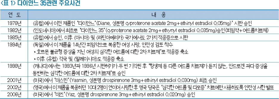 우리나라에서 2000년부터 약국에서 판매돼 온 한국쉐링(현 바이엘쉐링)의 경구피임약 ‘다이안느35’의 안전성 문제가 시판 후 7년이 경과한 현재 불거져 나왔다(작년 판매액 17억 원). 시민단체들이 이 제품의 안전성 및 허가사항 등에 문제를 집중적으로 제기하고 나왔기 때문이다. 여드름이 있는 여성을 위한 피임약으로서 피임에 여드름까지 치료하는 것으로 알려져 있던 이 제품은 여드름 치료만을 위해 쓰이며, 방법에 맞춰 사용할 경우 피임 효과를 제공한다는 사실을 일반 소비자들이 제대로 인식할 수 없었다는 점이 문제점으로 부각됐다. 이같이