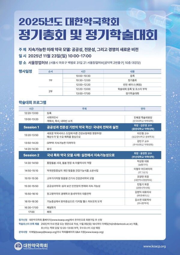 대한약국학회(회장 주상훈)는 오는 11월 23일(토) 서울 마포구 서울창업허브 대강당(10층)에서 '지속가능한 미래 약국 모델: 공공성, 전문성, 그리고 경영의 새로운 비전'을 주제로 2025년도 정기총회 및 추계학술대회를 개최한다고 3일 밝혔다. 이번 학술대회는 초고령사회와 인공지능 시대를 맞아 약국의 역할 변화에 대응하고, 공공성과 전문성을 강화해 지속 가능한 미래 약국 모델을 모색하기 위한 자리다. 주상훈 회장은 "약사 직능의 확장과 약국의 공공적 가치가 균형을 이루는 것이 지속가능한 발전의 핵심"이라며 "현안을 위기보다 기회