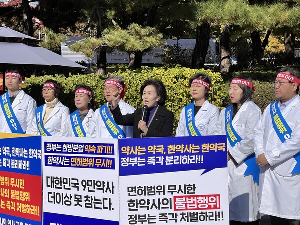 대한약사회(회장 권영희)가 1차·2차 릴레이 시위에 이어 세 번째 시위에 돌입했다. 최근 복지위 국감에서 불거진 약사-한약사 간 면허 범위 문제를 해결하기 위한 조치이며 상황에 따라 전국 단위 집회로 확대될 가능성도 점쳐진다.대한약사회는 지난 3일 서울 용산 대통령실 앞에서 '제3차 한약사 문제 해결 촉구 릴레이 시위'에 돌입했다. 약사회는 한약사 제도의 불법적 운영과 면허 체계 혼선을 바로잡기 위해 정부에 명확한 대책을 촉구했다.이번 3차 시위는 지난 9월 용산 대통령실 앞에서 진행된 1차, 10월 국회 정문 앞에서 진행된 2차