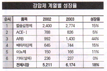 2003년 강압제시장 6,200억원대 구축‘노바스크’ 하락세… ‘자니딥’ㆍ‘시나롱’ 급성장ARB제제 전년대비 46%성장 1,430억원대향후 10위권내 제품간 선두자리 변화 예상최근 제약업계가 집계한 2003년 순수 항고혈압 약제 시장은 평균 6,200억원으로 6,000억원 시장을 훌쩍 뛰어넘었다. 이는 전년대비 약 17% 정도 증가한 것으로 당초 업계가 예측했던 20% 성장에 거의 근접했다. 업계 일각에서는 강압제 시장을 7,500억원 정도로 추산하고 있으나 이는 순수 강압제 이외에 고혈압 처방시 불가피하게 포함되는 정신계ㆍ신경계ㆍ