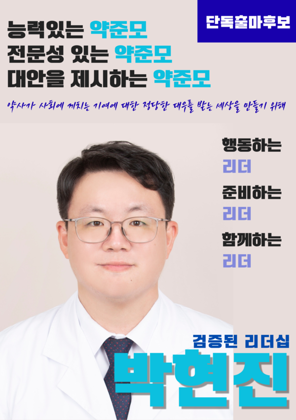 약사의 미래를 준비하는 모임(약준모)은 제 7대 회장 선거 결과, 박현진 약사가 당선됐다고 30일 밝혔다.이번 선거는 지난 10월 21~28일까지 총 8일간 진행됐으며 신임 회장 임기는 2026년 1월 1일부터 2028년 12월 31일까지 3년간이다.박현진 후보는 단일후보로 출마하였으며, 찬성 2580표와 반대 159표를 받아 득표율 94.19%로 최종 당선됐다.이번 선거 투표율은 53.37%로 전체 유권자수 모프회원 5752명 중 2739표가 유효표로 인정됐다.박현진 당선인은 "약사가 사회에 기여하는 가치만큼 정당한 대우를 받는