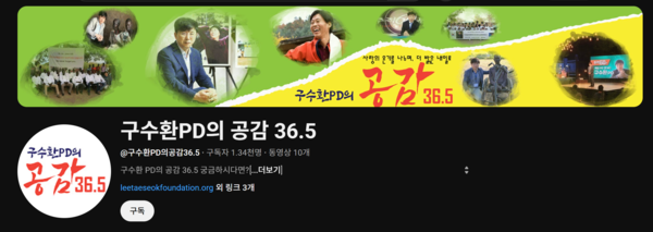 천만 관객 영화 '울지마 톤즈'를 연출한 구수환 감독이 유튜브 채널 '구수환PD의 공감 36.5'를 개설했다. '울지마 톤즈'는 남수단의 슈바이처라 불리는 고(故) 이태석 신부의 삶을 다룬 영화로 이 신부의 헌신적인 사랑과 희생을 다뤄 사회적으로 큰 반향을 일으켰다.이번에 새롭게 런칭한 유튜브 채널 '구수환PD의 공감 36.5'는 구수환 감독이 지난 30여년 동안 전 세계 취재 현장을 뛰어다니며 얻은 소중한 교훈 '성공과 행복은 물질적인 것이 아니라 자신의 소중함을 깨달을 때 찾아온다'를 전달하기 위해 만들어졌다.구 감독은 "세상에