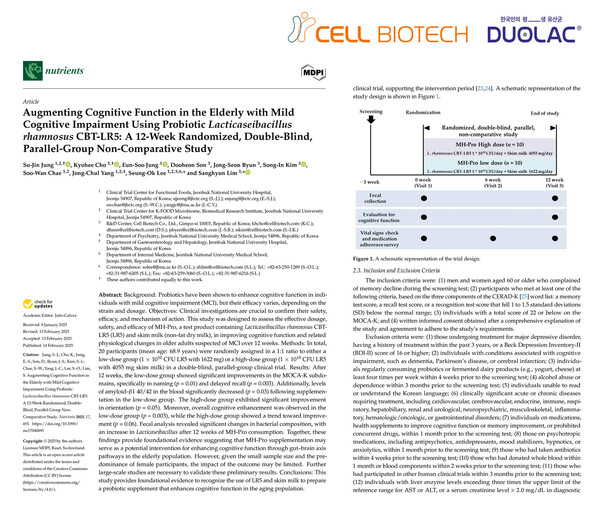 쎌바이오텍이 듀오락 주요 제품에 사용되는 특허 유산균 ‘CBT-LR5(KCTC 12202BP)’를 활용한 임상시험을 통해, 고령층 경도인지장애(MCI) 개선 가능성을 입증하며 장 건강이 뇌 건강에 영향을 줄 수 있다는 ‘장-뇌 축(Gut-Brain Axis)’ 이론에 새로운 과학적 근거를 제시했다고 16일 밝혔다. 이번 연구 결과는 영양 분야의 권위 있는 SCI급 국제 학술지 ‘뉴트리언츠(Nutrients, IF: 4.8)’에 게재되며, 치매 전 단계에 해당하는 MCI의 대안 치료법 개발 가능성을 국내외에 알렸다.국내 65세 이상