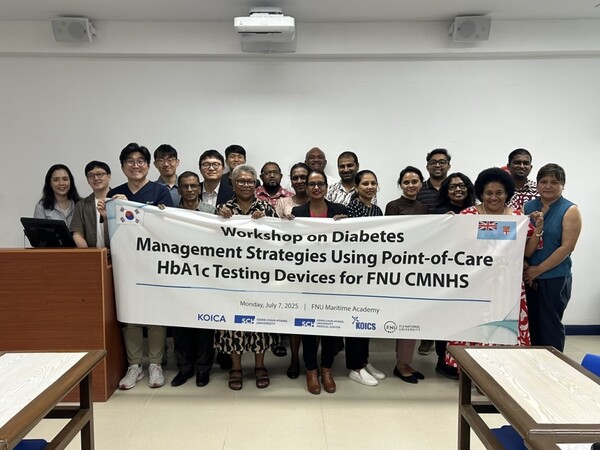 오상헬스케어는 순천향대학교와 피지 국립의대가 진행한 당뇨 관리 워크숍에 당화혈색소 측정기를 지원했다고 10일 밝혔다.순천향대학교 유병욱 교수팀은 7월 7일부터 8일까지 피지 국립의대에서 '현장진단 당화혈색소 측정기를 활용한 당뇨 관리 전략' 워크숍을 개최했다.피지는 인구 933,000명 중 성인의 약 16.6%인 90,300명이 당뇨 환자로 등록된 당뇨 고위험 국가다. 이번 워크숍에서는 당뇨 환자 조기 발견과 치료를 위한 현장진단 당화혈색소 측정기 활용 방안이 논의됐다.당화혈색소(HbA1c)는 최근 2~3개월간의 평균 혈당 상태를