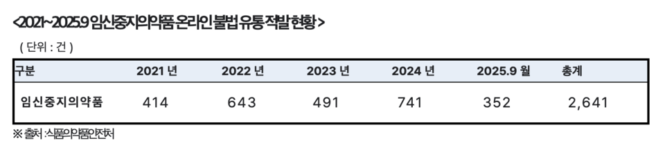 2019년 헌법재판소의 낙태죄 헌법불합치 결정으로 2021년부터 해당 조항의 효력이 상실됐지만, 여전히 임신중지 의약품은 도입되지 못해 불법 거래가 이어지고 있다. 특히 식품의약품안전처가 법 개정 여부와 무관하게 임신중지 의약품 허가가 가능하다는 법률 자문을 여러 차례 받고도 허가를 미루며 여성의 건강권 침해를 방치했다는 지적이 제기되고 있다.더불어민주당 남인순 국회의원(서울송파구병, 보건복지위원회)이 식품의약품안전처로부터 제출받은 '2021~2025.8 임신중지의약품 온라인 불법판매 적발 현황' 국정감사 자료에 따르면, 낙태죄 효