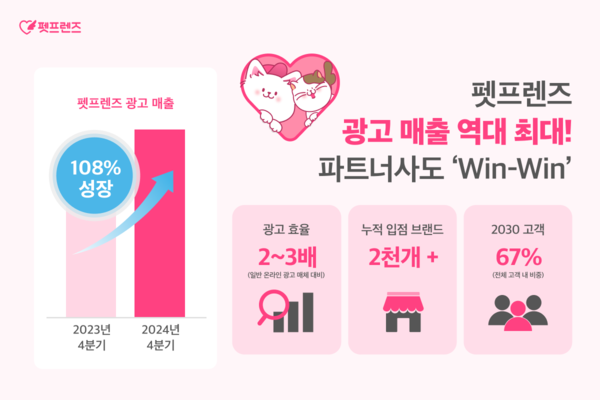 반려동물 1등 쇼핑몰 펫프렌즈(대표 윤현신)가 파트너사(입점사)와의 동반 성장을 위한 혁신적인 광고 시스템 도입을 통해 매출과 수익성이 급격히 증가하고 있다. 실제 펫프렌즈의 2024년 4분기 광고 매출은 역대 최대 실적을 기록하며 전년 동기 대비 108% 증가했다.이러한 광고 매출 증가는 자연스럽게 펫프렌즈의 빠른 수익성 증대로 이어진다. 광고 사업은 운영을 위한 추가 비용 부담이 적고 매출이 곧 영업이익으로 직결되는 수익성 높은 사업 모델이기 때문이다.펫프렌즈는 자사 광고 매출이 급성장한 배경으로 ▶지속 성장하는 거래액에 따른