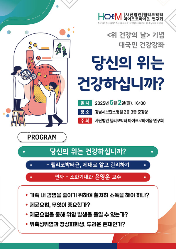 연세대 강남세브란스병원(병원장 구성욱)은 오는 6월 2일(월) 오후 4시 병원 중강당에서 일반인을 대상으로 한 건강강좌 ‘당신의 위는 건강하십니까? 헬리코박터균, 제대로 알고 관리하기’를 개최한다.이번 건강강좌는 사단법인 헬리코박터 마이크로바이옴 연구회와 함께 진행된다. 연구회는 위 건강에 대한 올바른 인식 확산과 예방 실천을 위해 매년 6월 첫째 주 수요일을 ‘위 건강의 날’로 지정하고 다양한 캠페인을 전개해오고 있다.강연자로는 강남세브란스병원 소화기내과장을 역임한 윤영훈 교수가 나선다. 윤 교수는 ‘당신의 위는 건강하십니까’라는