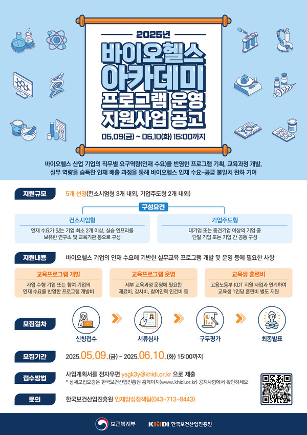 보건복지부(장관 조규홍)와 한국보건산업진흥원(원장 차순도)은 바이오헬스 분야 인재 수요-공급 불일치 완화에 기여하기 위해 산업 현장 수요 기반의 실무 인재양성 프로그램을 지원하는「2025년 바이오헬스 아카데미 프로그램 운영 지원사업」공모를 6월 10일까지 진행한다고 밝혔다.이 사업은 2025년부터 추진되는 신규 사업으로 바이오헬스 분야의 기업의 인재 수요에 기반한 실무교육을 이수한 인재 배출을 목표로, 기존 정부 및 민간에서 지원하고 있는 교육과정에서 해소할 수 없는 기업의 인재 수요를 중점으로 기업이 직접 프로그램 개발과 운영에