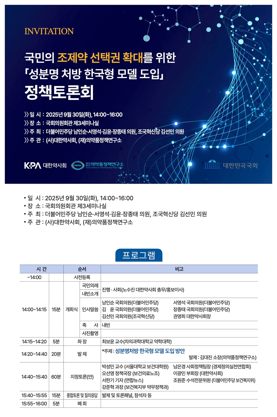 대한약사회(회장 권영희)는 국민의 조제약 선택권 확대를 위한 '성분명 처방 한국형 모델 도입' 정책토론회를 개최한다고 24일 밝혔다.이번 토론회는 오는 30일 오후 2시 국회의원회관 제3세미나실에서 열리며, 더불어민주당 남인순·서영석·장종태·김윤 의원과 조국혁신당 김선민 의원이 공동 주최하고 대한약사회와 의약품정책연구소가 주관한다.행사에서는 의약품정책연구소 김대진 소장이 발제를 맡고, 차의과학대학교 최보윤 교수가 좌장을 진행한다.토론에는 박성민 서울대 보건대학원 교수, 남은경 경제정의실천연합회 사회정책팀장, 오선영 보건의료노조 정책