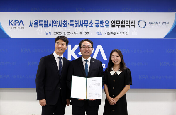 서울특별시약사회(회장 김위학)와 특허사무소 공앤유가 지난25일 서울시약사회관에서 지식재산 보호 및 디지털 혁신 지원을 위한 업무협약(MOU)을 체결했다.이번 협약식에는 김위학 서울시약사회 회장을 비롯해 김문관 전문위원, 특허사무소 공앤유(전화 02-598-0126) 공우상 대표 변리사와 권주영 대표 변리사가 참석했으며, 양 기관은 △약국·제약분야 지식재산(IP) 컨설팅 및 특허·상표 지원 △디지털 헬스케어·AI 기반 서비스의 지식재산권 전략 수립 △약사회 회원 대상 교육·세미나 공동 개최 등을 주요 협력 과제로 합의했다.김위학 회장
