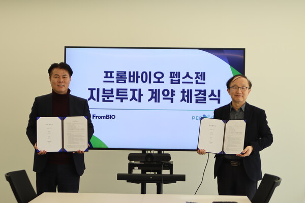 프롬바이오(377220, 대표이사 심태진)가 펩타이드 신약 개발 기업 펩스젠에 지분투자를 단행한다.프롬바이오는 1월 15일 펩스젠 지분 10.4%를 취득하는 지분투자 계약을 체결했다고 밝혔다. 이번 지분투자를 통해 프롬바이오는 펩스젠 3대 주주로 올라선다.프롬바이오는 펩타이드 기반 바이오-테크 기업 펩스젠 투자로 교모세포종 치료제 개발에 참여한다. 펩스젠을 이끌고 있는 강충경 박사는 이미 1998년 미국과 공동으로 연구 개발한 당뇨성족부궤양 펩타이드 치료제로 미국 FDA 임상 3상을 완료하는 등 펩타이드 의약품 분야에서 국내 최고로