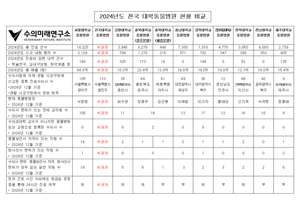 수의미래연구소는 2024년도 전국 대학동물병원의 총 진료건 수, 연 매출, 의료 인력 구성 등을 공개했다.수의미래연구소(이하 수미연)은 정보공개포털을 통해 각 대학교에서 취득하였으며, 수의사법에 따른 '동물병원 등록 진료수의사 수'의 경우 해당 정보를 각 대학 동물병원이 위치한 시군구청에서 확인하였다. '신규 내원 환자 수'의 경우 서울대 동물병원이 10개 대학 동물병원 중 가장 많은 수를 기록하였지만 3년간 지속적인 감소(2022년 - 3519마리, 2023년 - 2692마리)로 2024년에는 2129마리의 환자가 신규내원하였다.