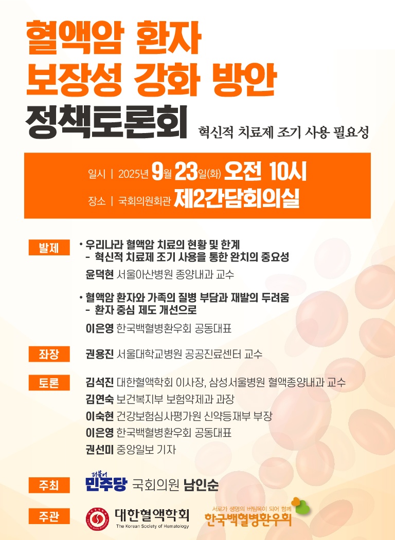 더불어민주당 남인순 의원은 오는 23일 오전 10시 국회의원회관 제2간담회의실에서 '혈액암 환자 보장성 강화 방안 정책토론회 – 혁신적 치료제 조기 사용 필요성'을 개최한다. 정책토론회에서는 DLBCL(미만성 거대 B세포 림프종)을 비롯한 혈액암 환자들의 재발과 불응 치료 한계, 질병·경제적 부담, 혁신적 치료제의 조기 사용을 통한 완치 가능성을 논의한다.행사 주관은 한국백혈병환우회와 대한혈액학회가 한다. 한국백혈병환우회는 "현재 혈액암 환자들은 치료 실패에 따른 재발·불응의 벽과 과도한 경제적 부담으로 여전히 큰 어려움을 겪고 있
