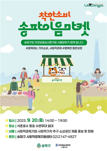 건강보험심사평가원 서울본부(본부장 김미향)는 오는 20일 지역사회 동반 성장을 위한 송파이음마켓을 개최한다. 행사는 석촌호수 동호 수변무대 일대에서 열리며 이날 송파구 대표 지역 축제인 2025 송파 청년축제도 진행된다.송파이음마켓은 송파구청과 관내 사회적 기업 등이 함께 하는 지역 상생 프로젝트로 경제 활성화와 사회적 가치 실현을 목표로 한다. 올해에는 관내 사회적 기업 등 13개 업체가 참여해 업사이클링 제품, 친환경 생활용품, 수공예품 등을 선보인다. 이 외에도 서울본부는 현장을 찾은 시민 대상으로 '내가 먹는 약 한눈에' 등