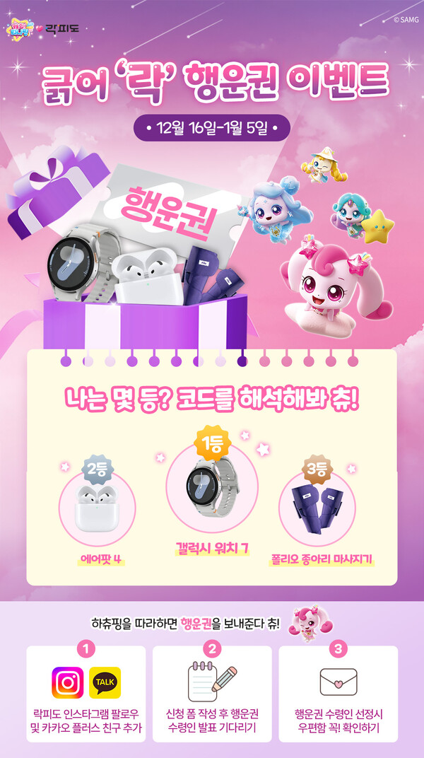 에프앤디넷의 생애주기별 영양 설계 전문 브랜드 ‘락피도’가 캐치! 티니핑 영양젤리 7종 리뉴얼 론칭을 기념해 12월 16일부터 1월 5일까지 3주간 행운권을 통해 경품을 제공하는 ‘긁어 ‘락’ 이벤트’를 진행한다.16일 락피도 공식 인스타그램에서 시작하는 ‘긁어 ’락’ 이벤트’는 캐치! 티니핑을 좋아하는 누구나 참여할 수 있는 행운 경품 이벤트로, 락피도 인스타그램 팔로우 및 카카오톡 플러스 친구 채널 추가 후 이벤트 신청란에 행운권 수령 주소를 입력하면 참여가 완료된다. 이벤트 기간 중 1,000명을 추첨해 매주 행운권을 우편 발