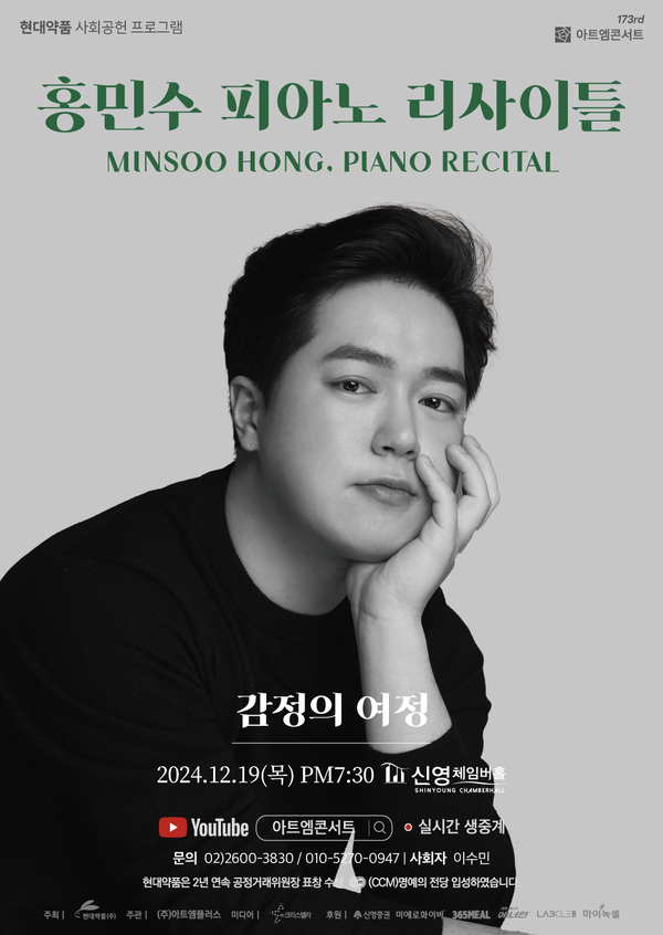 현대약품이 제173회 아트엠콘서트로 피아니스트 홍민수의 독주회를 오는 19일 오후 7시 30분에 서울 영등포구 신영체임버홀에서 개최한다.이번 아트엠콘서트에서 홍민수는 ‘감정의 여정’을 주제로 △프란츠 리스트 - 中 세 번째 해, S. 163, 앙겔루스! 수호천사에의 기도 △루트비히 판 베토벤 - 피아노 소나타 제8번 c단조, Op. 13 “비창” △로베르트 슈만 - 환상곡 C장조, Op. 17 등 대표적인 걸작을 연주하며, 풍부한 선율을 선사할 예정이다.피아니스트 홍민수는 2017년 네덜란드 ‘프란츠 리스트 피아노 콩