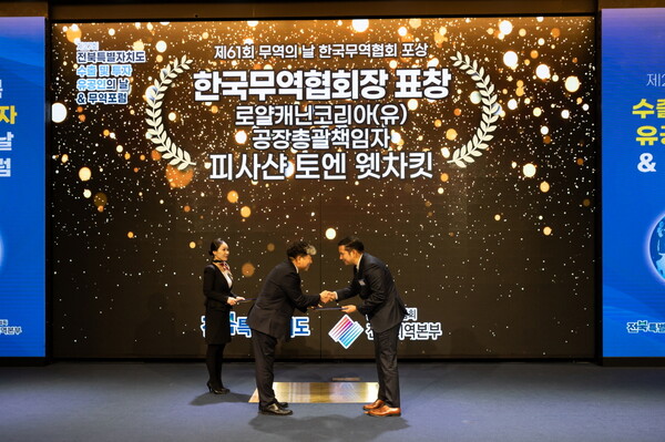 로얄캐닌코리아가 17일 전주 그랜드힐스턴 호텔에서 진행된 제27회 전라북도 수출 및 투자 유공인의 날 행사에서 ‘수출 유공자상’을 수상했다.한국무역협회 전북지역본부가 주최하는 ‘전라북도 수출 및 투자 유공인의 날’ 행사는 도내 수출 증진과 지역경제 활성화에 기여한 기업들의 성과를 축하하고 노고를 격려하는 자리로, 로얄캐닌코리아는 K-펫푸드 수출을 견인하며 도내 지역 경제 발전에 이바지한 공로를 인정받아 이번 상을 수상했다.로얄캐닌 김제공장은 2018년 설립 이래로 펫푸드 업계 최고 수준의 생산 기술과 독보적인 품질 및 식품 안전 시