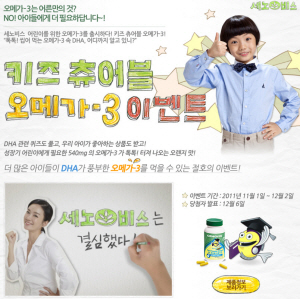 호주 건강기능식품 1위 기업의 전통과 기술로 만들어진 세노비스는 ‘키즈 츄어블 오메가-3’ 출시를 기념해 홈페이지(www.cenovis.co.kr)를 통한 퀴즈 이벤트를 진행한다. 이번 퀴즈 이벤트는 세노비스 홈페이지에 접속해 아이들 두뇌 영양에 좋은 영양소 DHA와 관련된 퀴즈를 맞추면 응모가 완료된다. 참여 기간은 11월 1일부터 12월 2일까지 한 달간이며, 당첨자는 12월 6일 발표된다. 1등에게는 신제품 ‘키즈 츄어블 오메가-3’ 10개월분을 제공하며 2등 25명에게는 라트어린이극장 어린이 영어 뮤지컬 초대권을 증정한다.