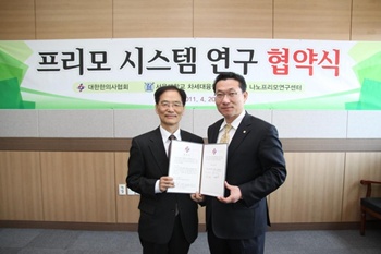 대한한의사협회(회장 김정곤)는 지난 20일 협회 중회의실에서 서울대학교 차세대융합기술연구원 나노프리모연구센터와 프리모 시스템 연구지원과 관련한 업무협약을 체결했다. 이번 업무협약을 통해 한의협은 내년 3월 31일까지 한의학적 치료기술의 기전을 규명하기 위한 경락 시스템 및 프리모 시스템 연구를 지원하고 센터에서는 연구결과물을 국제학술지에 논문으로 발표하며, 양측은 연구결과에 대한 공동권리를 갖게 된다. 프리모 시스템이란 경락의 실체를 규명하는 데 꼭 필요한 원초적 순환계를 뜻하며 ‘프리모’란 용어는 혈관이나 신경보다 먼저 생겨난 ‘