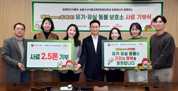 로얄캐닌코리아가 농림축산식품부(이하 ‘농식품부’)와 함께 사료 기부 이벤트인 ‘해삐(HAPPY) 투게더!’를 통해 적립된 사료 2.5톤을 전국 유기∙유실 동물 보호소에 기부했다.‘해삐투게더’는 농식품부와 동물복지 인식 개선과 유기동물 보호, 입양 활성화를 위해 함께한 이벤트로 ‘가족의발견 일상티콘(누누∙해삐∙또)’ 캐릭터 스티커를 사용하여 블로그와 인스타그램에 게시물을 작성하면 게시물 1개당 로얄캐닌 사료 1kg가 적립됐다.지난 9월 26일부터 10월 16일까지 3주간 모인 많은 게시물에 로얄캐닌은 연말 따뜻한 손길을 전한다는 취지