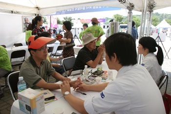 대한한의사협회(회장 김정곤)는 나눔 문화 확산을 위해 지난 17, 18일 양일간 상암동 월드컵공원에서 개최된 ‘제1회 대한민국 나눔문화대축제’에 참여해 무료 진료 및 각종 한의약 체험을 진행했다. 이번 축제에 의료단체로는 유일하게 참가한 한의협은 이틀간 시민과 자원봉사자 500여 명을 대상으로 진찰 및 침, 뜸, 부항 시술과 보험약 처방 등 의료봉사활동을 벌였다. 또한 무료진료와 함께 행사장을 찾은 시민을 대상으로 전국 상설 한방의료봉사 현황을 소개하고, 시민들이 기증하고 싶은 건강보조기기와 지원대상을 선택하면 시민들의 참여도에 따