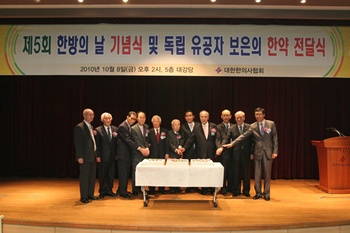대한한의사협회(회장 김정곤)는 지난 8일 오후 2시 협회 5층 대강당에서 ‘제5회 한방의 날 기념식 및 독립유공자 보은의 한약 전달식’을 개최하고 독립유공자 55인에 보은의 한약을 전달했다. 이번 행사에서는 경술국치 100년을 맞아 서울과 경기지역에 거주하는 독립유공자 55인 전원에게 한약이 제공됐으며, 한의사 출신 독립유공자인 故 강우규 의사와 故 이원직 선생을 기리는 차원에서 후손들에게 감사패가 전달됐다. 이날 김정곤 회장은 “우리 민족의 자랑스러운 유산인 한의학의 우수성을 대내외에 널리 알리고 한의학의 이미지 제고와 활성화를