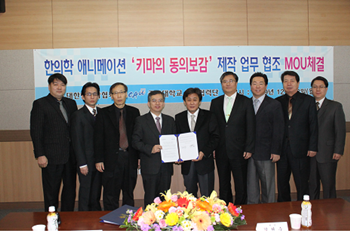 대한한의사협회(회장 김현수)는 지난 28일 협회 회관에서 중앙대학교 산학협력단(단장 이정희)과 한의학 애니메이션 ‘키마의 동의보감’ 제작 업무협약(MOU)을 체결했다. 이날 MOU를 통해 한의협은 ‘키마의 동의보감’ 영상 콘텐츠 제작에 필요한 한의학 자문과 자료를 제공키로 했으며 중앙대학교 산학협력단은 제공된 자료가 해당 콘텐츠에 연동되도록 적극 협조키로 협의했다. 김현수 회장은 "우리 한의학이 갖고 있는 내재적 가치는 수백조 원에 이른다"며 "한의학을 활용한 애니메이션 '키마의 동의보감'이 국내외 어린이들에게 한의학 및 한국의 전