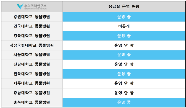 수의미래연구소(이하 수미연)는 전국 대학동물병원의 응급실 운영 현황과 2020년부터 2023년까지 진료비 감면 내역을 조사해 발표했다.수미연에 따르면 전국 10개 대학동물병원 중 건국대학교 동물병원을 제외한 나머지 9개 국립 대학동물병원에서 조사에 참여했다. 수미연은 2024년 11월 현재, 전국 9개 국립 대학동물병원 중 강원대학교 동물병원, 경북대학교 동물병원, 서울대학교 동물병원, 전북대학교 동물병원, 충북대 동물병원에서는 정규 근로 시간 이외에도 응급실 운영 등을 통해 24시간 운영이 되고 있다고 밝혔다.전국 9개 국립 대학