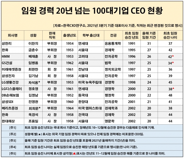100대 기업 CEO의 중 최장수 임원은 삼천리 이찬의 부회장으로 지난 1991년 이사직을 맡으며 임원에 올라 31년간 임원자리를 지키고 있었으며, LG생활건강 차석용 부회장은 동일 회사에서 17년째 CEO로 재직하며 가장 오랫동안 대표이사로 활약하는 기록을 세웠다.100대기업 최장수 임원, 삼천리 이찬의 부회장한국CXO연구소 ‘100대기업 전문경영인 임원 이력 추적 조사’에 따르면 100대 기업 CEO로 활약 중인 대표이사 중 최장수 임원인 주인공은 삼천리 이찬의 부회장인 것으로 확인됐다. 1954년생으로 올해 만67세인 이찬의