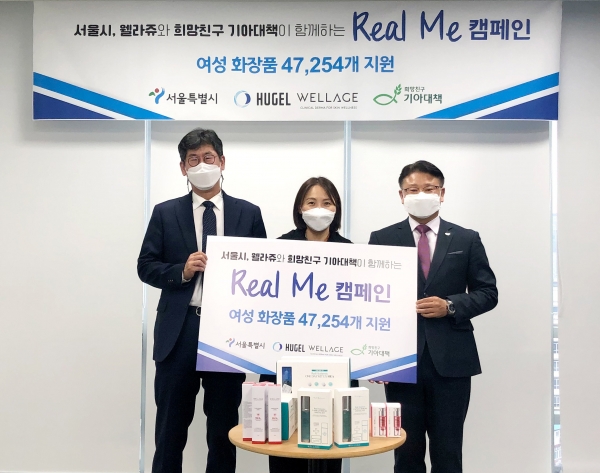 휴젤이 서울시가 진행한 리얼 미 캠페인’ 통해 올해 취약 계층 여성 대상 화장품 4만 7천개를 기부했다.휴젤 웰라쥬(Wellage)는 서울시, 희망친구 기아대책과 협력해 진행한 ‘리얼 미(Real Me) 캠페인’을 통해 올해 2회에 걸쳐 총 4만 7천여 개의 자사 화장품을 기부하며 훈훈함을 전했다.휴젤 웰라쥬는 지난 9일 서울시청 서소문 2청사에서 열린 기부 제품 전달식에서 자사 화장품 약 1만 2천여 개를 전달했다고 밝혔다. 행사에는 휴젤 진윤진 상무, 서울시 이원목 시민협력국장, 희망친구 기아대책 박재범 본부장을 비롯한 기부 관