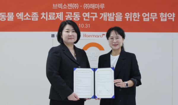해마루(대표이사 김소현)와 엑소좀 치료제 개발 기업 브렉소젠 주식회사(대표이사 김수)가 지난 10월 31일, 줄기세포 엑소좀을 활용한 반려동물 치료제 공동 연구개발을 위한 업무협약(MOU)을 체결했다. 이번 협약은 경기 분당구에 위치한 해마루동물병원에서 양사 대표와 연구 책임자들이 참석한 가운데 진행되었으며, 반려동물의 간질환 개선을 위한 치료제 개발에 협력하기로 했다.이번 협약을 통해 해마루와 브렉소젠은 △줄기세포 엑소좀의 공급 △엑소좀 기반 임상 적용과 효과 분석 △임상 연구 결과 공유 △반려동물 치료제 공동 개발 시스템 구축