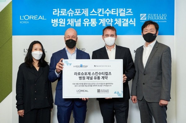 로레알코리아가 전세계 9만명의 피부전문가가 추천하는 스킨케어 브랜드 라로슈포제 등을 병원 및 의원에 공급한다.로레알코리아는 글로벌 의약품 전문 유통회사 쥴릭파마코리아와 라로슈포제, 스킨수티컬즈의 병원 및 의원 공급 파트너십을 체결했다고 12일 밝혔다. 체결식에는 로레알코리아 크리스티앙 마르코스 대표와 쥴릭파마코리아 어완 뷜프 대표가 참석했다.로레알코리아 병원약국 사업부 브랜드인 라로슈포제와 스킨수티컬즈는 오랜 역사와 피부 전문가의 연구 결과를 기반으로 쌓인 높은 신뢰도를 바탕으로 국내에서 많은 소비자들에게 사랑받고 있는 브랜드다.이