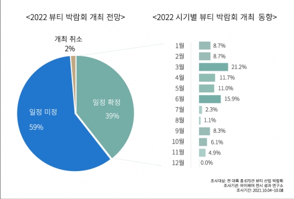 2022년 뷰티 박람회 670건 중 일정이 확정된 건은 264건, 미확정 상태는 397건으로 주로 3월에서 6월 사이에 집중 된 것으로 나타났다. 마이페어는 내년도 박람회 참가 계획을 수립하는 국내 기업 일정에 맞춰 2022년도 뷰티 박람회 신규 정보를 13일에 공개했다.마이페어 플랫폼에서 화장품 원료 및 제조, 완제품을 비롯한 피부 미용, 헤어, 네일 등 뷰티 산업 전 분야의 박람회 정보를 산업별, 국가별, 일정별로 구분하여 제공한다.2022년도에 예정된 뷰티 박람회는 670건이나 일정이 확정된 박람회는 264건, 일정이 미정인
