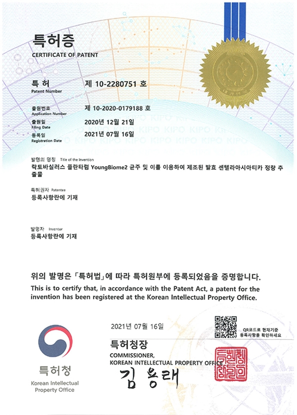 20대 여성 피부로 부터 락토바실러스 플란타럼 YoungBiome2 균주를 분리해 주름개선, 피부상처회복 및 탄력 개선 효과를 부여 할 수 있는 조성물이 개발됐다.한국화장품제조는 ‘락토바실러스 플란타럼 YoungBiome2 균주로 발효된 센텔라아시아티카 정량 추출물의 제조 방법 및 화장료 조성물’에 관한 특허를 취득했다고 밝혔다. 20대 건강한 여성의 피부로부터 락토바실러스 플란타럼 YoungBiome2 균주를 분리 동정하였고, 이를 이용하여 발효 센텔라아시아티카 정량 추출물을 제조할 때, 주름개선, 피부 상처 회복, 피부 치밀도