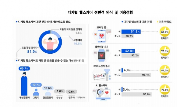 디지털 헬스케어가 개인 건강상태 개선에는 도움이 될 것이라는 평가가 높은 반면 과도한 상업적 활용에 대한 우려가 큰 것으로 조사됐다. 개인 보건의료 데이터 제공에 대해서는 공공 목적에 대해서는 긍적적인 응답이 높았으나 민간서비스를 목적으로 한 제공은 절반이상 제공에 대해 부정적인으로 응답했다.KDI 경제정보센터는 디지털 헬스케어 분야에 대한 일반 국민의 인식과 경험, 수요를 파악하기 위해 전국 만 20세 이상 성인남녀 1,000명을 대상으로 온라인 설문조사를 실시한 결과를 발표했다.건강상태 개선 도움 될것 VS 과도한 상업적 사용