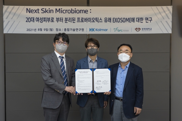한국콜마가 20대 여성 피부에서 분리된 프로바이오틱스 유래 엑소좀(EXOSOME)을 유효 성분화해, 피부에 효과적으로 전달하는 안티에이징 화장품 개발에 나섰다.한국콜마는 바이오 소재 전문 기업 GFC 생명과학, 경희대 유전생명공학과와 서울 내곡동 소재 종합기술원에서 '20대 여성피부로부터 분리된 프로바이오틱스 유래 엑소좀에 대한 공동 연구'에 관한 업무협약(MOU)’을 체결했다고 10일 밝혔다. 이날 협약식에는 한국콜마 기술연구원 강학희 원장(사장)과 GFC생명과학 강희철 대표이사, 경희대학교 유전생명공학과 황재성 교