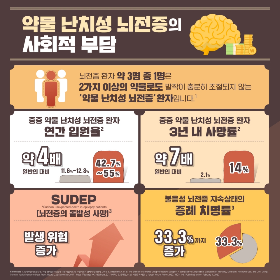한국유씨비제약(대표이사 황수진)이 29일 인포그래픽을 통해 ‘약물 난치성 뇌전증(Drug-resistant Epilepsy)’ 환자의 높은 사회적 부담을 소개했다.뇌전증은 2017년 기준 국내 인구 1,000명당 약 4.8명이 앓고 있는 흔한 중추신경계 질환이며 원인 및 발생 양상이 다양하다. 국내 뇌전증 환자의 30% 이상은 2가지 이상의 약물로도 발작이 충분히 조절되지 않는 ‘약물 난치성 뇌전증’ 환자에 해당하며, 약물 난치성 뇌전증 환자는 일반 뇌전증 환자보다도 더 높은 사회경제적 부담을 가지고 있으나 그동안 제대로 조명되지