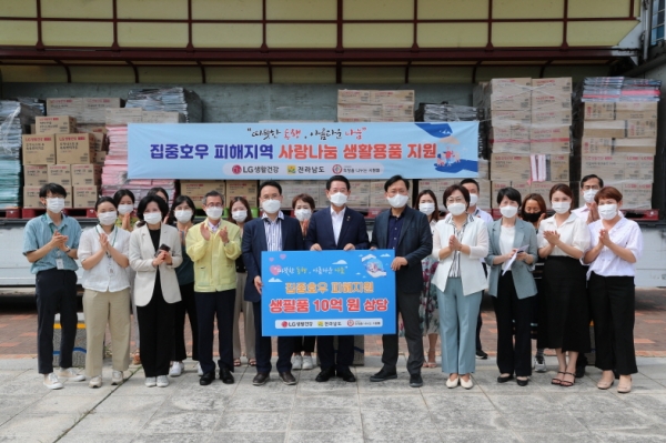 집중호우로 피해를 입은 전라남도에 LG 생활건강이 10억원 상당의 생활용품을 기부했다.LG생활건강은 지난 20일 오후 전남도청 광장에서 열린 ‘집중호우 피해지역 사랑나눔 생활용품 지원’ 행사에 참석해 ‘(사)희망을나누는사람들’을 통해 기부 물품을 전달했다고 밝혔다.전달된 물품은 샴푸, 린스, 바디워시, 치약, 칫솔 등으로 구성된 생활용품 11톤 트럭 10대 분량, 약 10억원 상당의 물품을 집중호우 피해지역인 고흥, 장흥, 강진, 해남, 진도에 기부할 계획이다.김영록 전남도지사는 “최근 집중호우로 힘든 시기를 보내는 도민들에게 따뜻