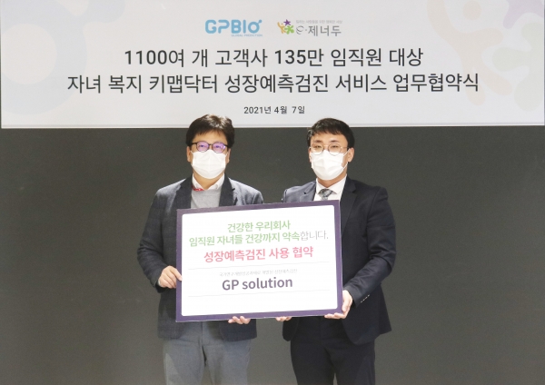 복리후생 전문기업 이제너두(대표이사 송동진)와 수년간 측정을 통한 빅데이터 및 AI 분석 기술 바탕 성장예측시스템을 가진지피바이오(대표이사 성제혁)가 7일 업무협약식을 체결했다.이번 업무협약식을 통해 지피바이오는 이제너두 135만명 기업고객에게 주력제품인 키맵닥터 성장예측검진을 제공한다. 이제너두는 보유하고 있는 복지몰과 운영 노하우를 통해 키맵닥터 성장예측검진 홍보와 판매를 담당할 계획이다.성제혁 지피바이오 대표는 “ 다수 기업을 대상으로 인터뷰를 진행한 결과, 임직원 자녀들에 대한 성장 관련 복지서비스에 높은 관심을 갖고 있음을