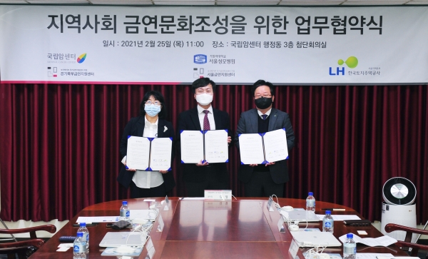 [팜뉴스=이석훈 기자] 국립암센터(원장 서홍관) 경기북부금연지원센터는 2월 25일(목) 국립암센터에서 한국토지주택공사 서울지역본부(본부장 오영오, 이하 LH), 서울금연지원센터(센터장 이강숙)와 지역사회 금연문화조성을 위한 업무협약을 체결했다고 26일 밝혔다.국립암센터 경기북부금연지원센터(센터장 김열)와 서울금연지원센터는 본 협약을 통해 서울과 경기 지역의 LH 서울지역본부 산하 임대주택 및 공공주택 단지에서 ▲찾아가는 금연지원서비스 제공 ▲지역사회 주거복지 대상자의 금연문화조성을 위한 연계 및 협력 ▲각 사업과 관련된 홍보 활동