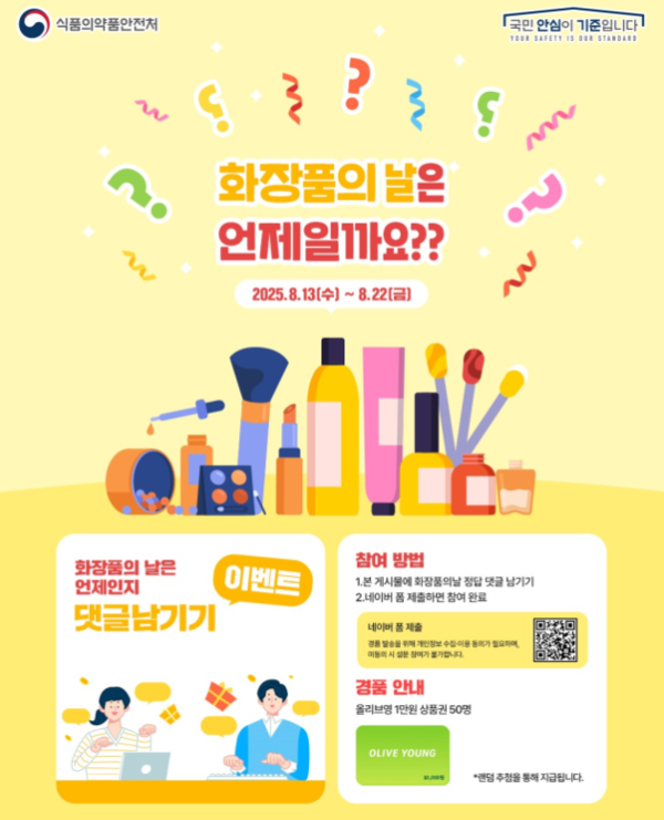 식품의약품안전처(처장 오유경)는 올해부터 매년 9월 7일로 지정된 ‘화장품의 날’이 ‘화장품법’ 개정(2025년 4월 1일)으로 법정 기념일이 됨에 따라, 이를 기념하는 다양한 행사를 개최한다고 밝혔다. 이번 기념일은 우리 화장품의 안전과 품질을 높여 국제 경쟁력을 강화하고, 국민이 보다 안전하게 화장품을 사용하는 데 필요한 이해와 관심을 넓히기 위해 마련됐다.대표 행사는 9월 5일 서울 강서구 코엑스 마곡에서 열리는 ‘2025년 화장품의 날’ 기념식이다. ‘K-코스메틱, 세계를 물들이다’를 주제로 정부, 국회, 산업계가 한자리에