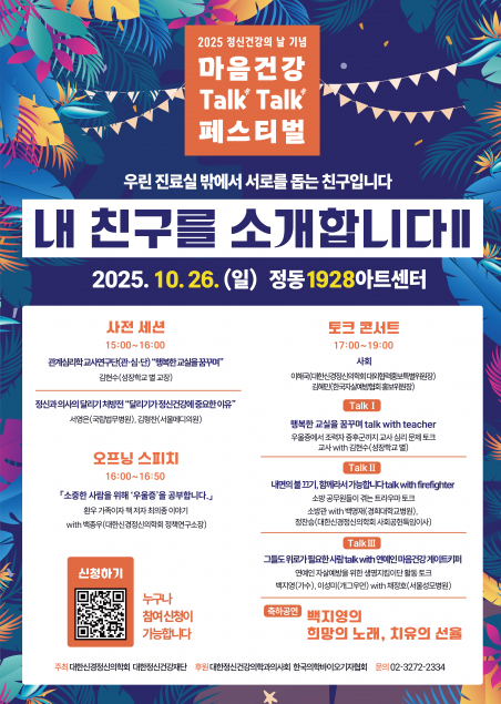 대한신경정신의학회와 대한정신건강재단은 2025년 정신건강의 날을 맞아 의사와 환우, 사회 각 분야에서 정신건강에 관심을 갖고 활동하는 전문가, 시민, 유명인이 함께하는 토크콘서트 ‘마음건강 Talk Talk 페스티벌 - 내 친구를 소개합니다Ⅱ’를 연다.지난해 첫선을 보인 ‘내 친구를 소개합니다’는 참가자들의 높은 호응을 받아 올해 시즌2로 다시 열린다. 이번 행사는 '우리는 진료실 밖에서 서로를 돕는 친구입니다'를 주제로, 정신건강에 관심을 갖고 실천하는 시민과 전문가가 한자리에 모여 서로의 이야기를 나누고 마음을 돌보는 소통의 장