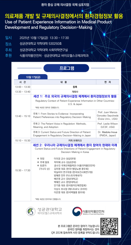 성균관대학교 약학대학이 오는 17일 ‘환자중심 규제의사결정(Patient-Centered Regulatory Decision-Making)’을 주제로 한 국제 심포지엄을 연다. 의료제품 개발과 규제의사결정 과정에서 환자경험정보를 어떻게 반영할지 논의하는 자리로, 성균관대 사회약학연구실이 주관하고 식품의약품안전처와 성균관대 바이오헬스규제과학과가 후원한다.이번 심포지엄은 ‘의료제품 개발 및 규제의사결정에서의 환자경험정보 활용’을 중심 의제로, 두 개의 세션으로 진행된다. 첫 번째 세션에서는 해외 주요 규제기관의 실제 사례를 통해 환자중