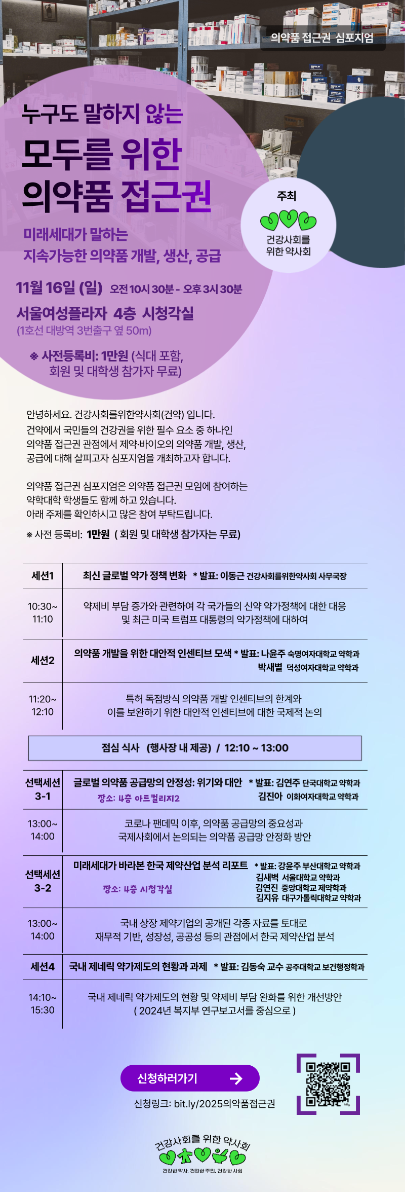 건강사회를위한약사회(이하 건약)는 11월 16일 서울여성플라자 4층 시청각실에서 약사, 약학대학 학생, 그리고 의약품 접근권에 관심 있는 일반인을 대상으로 '모두를 위한 의약품 접근권' 심포지엄을 개최한다고 밝혔다.이번 행사는 오전 10시 30분부터 오후 3시 30분까지 진행되며, 사전등록비는 1만 원이다. 다만 회원과 대학생 참가자는 등록비가 면제되며, 점심이 제공될 예정이다. 건약은 모든 사람이 처한 환경과 조건에 관계없이 양질의 의약품을 감당할 수 있는 가격에 적절히 사용할 수 있는 '의약품 접근권'이 보장되는 사회를 만들기