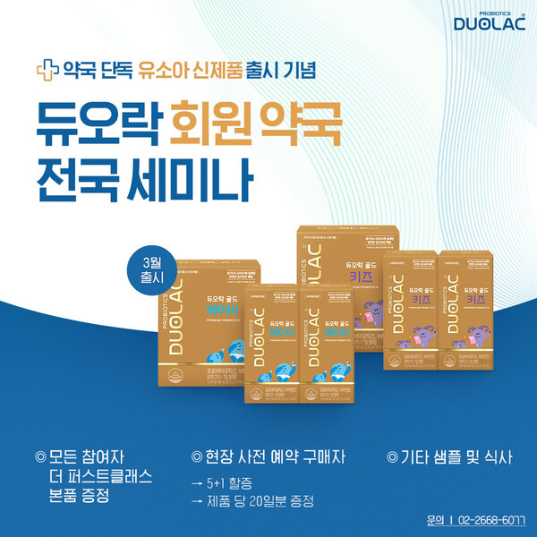 ‘듀오락(DUOLAC)’이 약국 단독 유소아 신제품 출시를 기념해, 오는 3월 전국 8개 지역에서 ‘약사 세미나’를 개최한다고 25일 밝혔다.약사 세미나는 유산균 연구 동향, 최신 정보, 올바른 제품 선택 기준 등을 약사들과 공유하는 연구회로, K-유산균의 세계화를 선도하는 쎌바이오텍이 2007년부터 주최해 온 행사다. 세미나는 국내외 유산균 시장 성장에 기여하고 있으며, 약사들 간의 전문가적인 소통의 장을 제공하고 있다.이번 세미나는 전국 8개 지역을 순회하며 진행된다. 3월 12일, 천안∙아산을 시작으로 ▲제주(13일) ▲서울