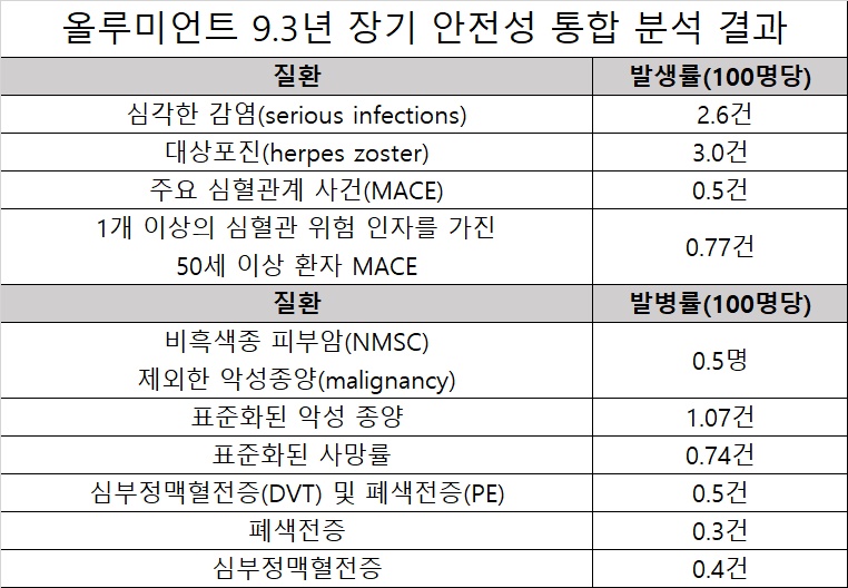 JAK(Janus kinase)억제제 올루미언트(바리시티닙)가 류마티스 관절염 치료에서 장기 사용 가능성을 입증하며 전문가들로부터 '초록딱지'를 받았다. 유의한 혜택을 가진 효과는 알고 있었지만 안전성까지 인정받았다.작년 11월 미국류마티스학회 학술대회(American College of Rheumatology, ACR)에서 총 10건의 임상 연구를 포함한 장기 안전성 통합 분석 결과를 내놓으면서 이같은 평가가 뒤따르고 있다.해당 발표 이후 올루미언트는 최대 9년 이상 안전하게 사용할 수 있다는 점을 국내외적으로 인정받고 있으며,