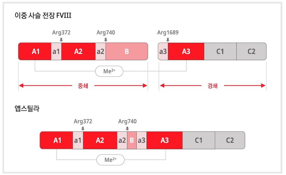 싱글체인(단일사슬형) 기전을 적용한 A형 혈우병 치료제로는 '앱스틸라(로녹토코그알파)'가 있다. 앱스틸라는 기존 혈우병 치료제가 두 개의 단백질 체인이 분리된 형태인 것과 달리 하나로 결합, 체내 작용 시간을 향상시킨 치료제다.앱스틸라의 또 다른 특징은 모태가 한국이라는 점이다. 최초 SK케미칼이 유전자재조합 바이오 신약 물질 'NBP601'로 개발했다. 2009년 씨에스엘베링(CSL Behring Korea)이 기술을 사들여 상업화까지 이루면서 국내 제약바이오 산업에서 성공적인 역수입 사례가 됐다.지난 2020년 1월 20일 식품