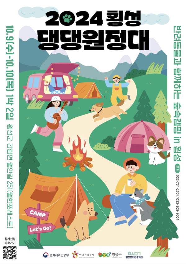 횡성군은 반려동물과 함께 숲속 캠핑을 즐길 수 있는 ‘횡성 댕댕원정대’를 10월 9일~10일에 개최한다고 밝혔다.‘횡성 댕댕원정대’는 반려동물과 함께 여행 가고 싶은 사람들을 위해 1박 2일 일정으로 진행되는 이색 캠핑 행사로, 횡성의 아름다운 숲속 자연을 즐기며, 반려동물과 함께 캠핑을 즐길 수 있는 행사이다.반려인들이 함께 즐길 수 있는 버스킹 공연과 전문 강사가 진행하는 토크쇼가 운영될 예정이며, 자유롭게 뛰어놀 수 있는 오프리쉬 운동장도 조성된다. 또한, 반려 생활에 도움 되는 다양한 체험부스도 마련될 예정이며, 대중교통을