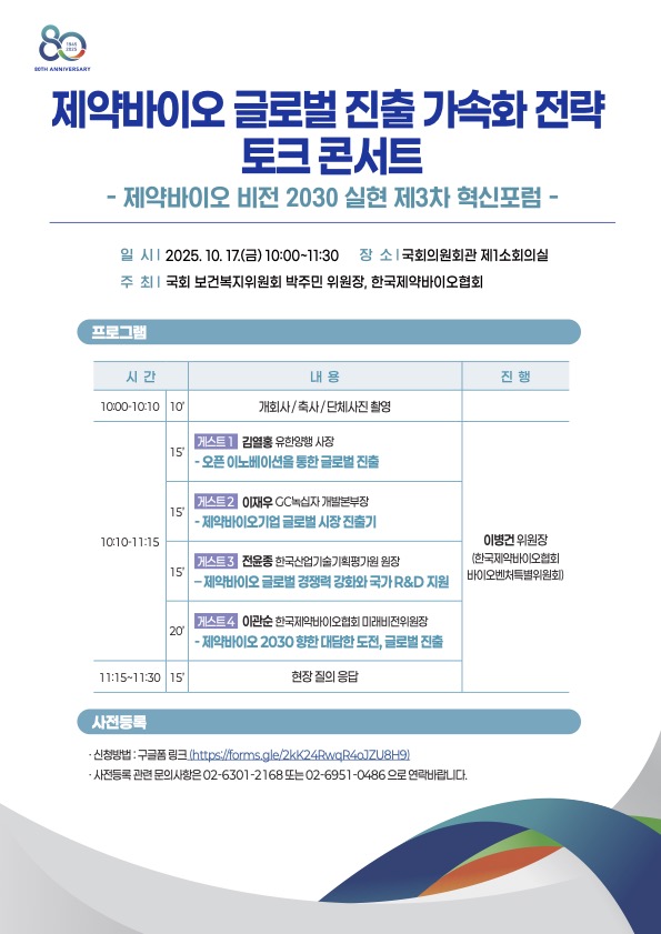 한국제약바이오협회(회장 노연홍)는 국회 보건복지위원회 박주민 위원장과 함께 오는 10월 17일 오전 10시 국회 의원회관 제1소회의실에서 '제약바이오 비전 2030 실현 제3차 혁신포럼 – 제약바이오 글로벌 진출 가속화 전략 토크 콘서트'를 개최한다고 밝혔다. 앞서 협회는 ▲1차 포럼에서 'K-제약바이오 미래비전'을 제시하고, ▲2차 포럼에서는 '국민건강 안전망 구축을 위한 의약품 제조역량 강화방안'을 논의한 바 있다. 이번 3차 포럼은 이를 이어받아 국내 제약바이오기업의 글로벌 시장 진출 성과와 과제, 민관 협력 및 혁신 생태계